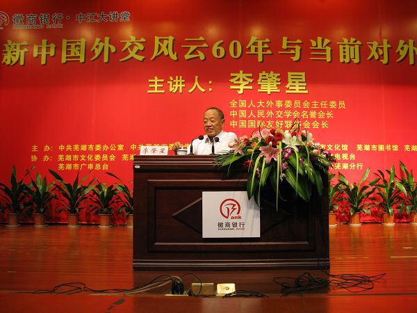 9月27日上午,应中共芜湖市委办公室、中共芜湖市委宣传部和市文明办邀请,全国人大外事委员会主任委员、中国人民外交学会名誉会长、中国国际友好联络会会长、外交部原部长李肇星走进“徽商银行·中江大讲堂”,在我校南校区大学生活动中心作题为“新中国外交风云60年与当前对外工作”的报告。校党政领导与芜湖市委、市政府领导、市属其他部门同志以及我校部分师生一起聆听了报告。