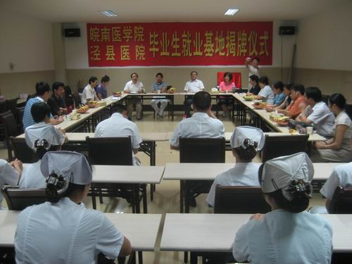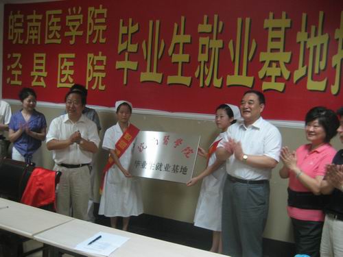 揭牌仪式中,校党委书记卞国忠与泾县医院院长胡宝生签定了毕业生就业基地协议,共同为基地揭牌。