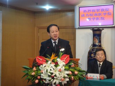 元月10日下午,我校教学医院——安徽省立医院揭牌仪式在该院多功能学术会议厅隆重举行。校党委副书记、院长宋建国,副院长李朝品,教务处处长王丽,医学一系总支书记杨新庆,医学二系总支书记、主任姜国年,护理学系副主任朱丹,办公室行政科科长李国柱,教务处实践教学科副科长余结根;省卫生厅副厅长杜昌智、科教处处长叶丽,安徽省立医院院长许戈良、副院长李建生、严光,医院职能部门负责人和二、三级学科教研室主任、教学主任、教学秘书、科护士长及我校实习同学共130多人参加了揭牌仪式。