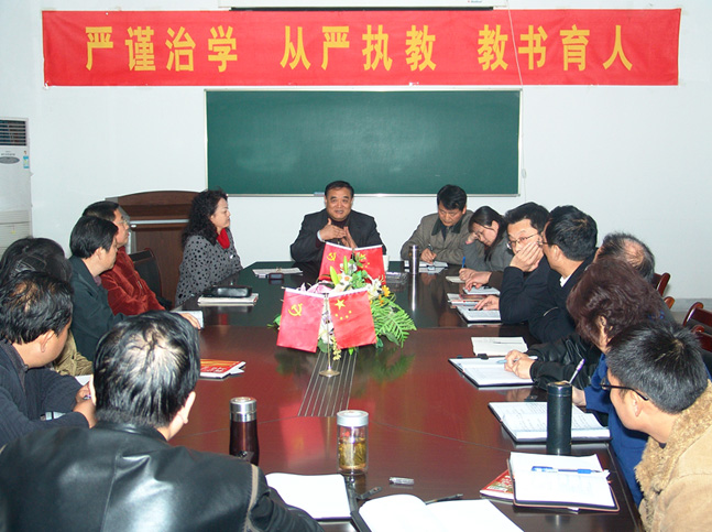 2008123下午,基础部召开了2008-2009学年第一学期第11次教学工作例会,参加会议的有各教研室、实验室主任及基础部党总支委员、党支部书记。校党委书记卞国忠同志莅临会议,会议由基础部主任张根葆主持。例会传达了校党委关于深入学习和贯彻落实科学发展观的相关精神,对迎接学校50周年校庆、教职工年度考核、教学质量监控、年度工作量核实、期末考试准备等工作进行了具体安排和布置。