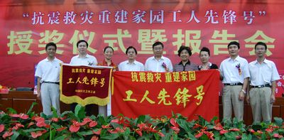 9月5日下午,省教育工会主办的“抗震救灾重建家园工人先锋号”授奖仪式暨报告会在合肥隆重举行,我校弋矶山医院赴川抗震救灾医疗队同时被中华全国总工会和中国科教文卫体工会授予“抗震救灾重建家园工人先锋号”称号。省教育工会和省教育厅领导宣布表彰决定,并代中华全国总工会和中国科教文卫体工会授“抗震救灾重建家园工人先锋号”旗。弋矶山医院院长、抗震救灾医疗队队长芮景同志作为受表彰集体代表作抗震救灾先进事迹报告。来自医疗卫生和教育战线的650余名代表参加了大会。