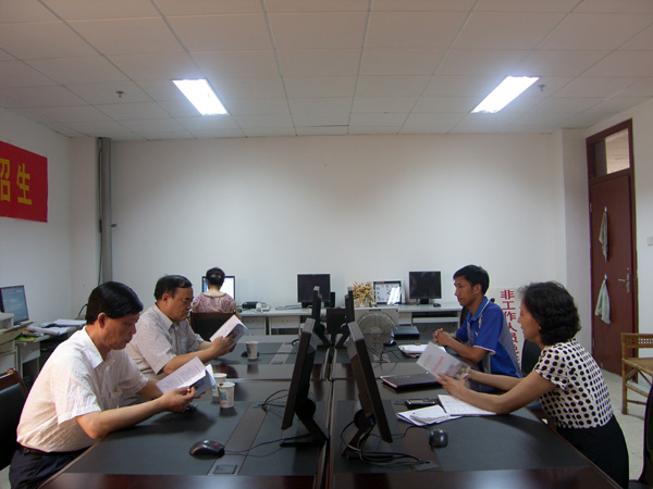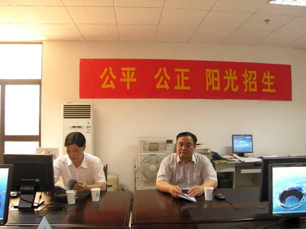 7月17日下午,党委书记卞国忠和院长宋建国亲临招生现场,对我校招生准备工作进行检查。在听取了招办王丽主任关于招生准备工作的情况汇报后,对今年的招生工作作出明确指示。要求本着“公平、公正、阳光招生”的原则,做到万无一失,确保招生工作顺利进行。要求招办同志按照上级有关规定精神,认真严格履行职责,注意每一个细节问题,确保招生期间的各项工作落实到位,确保招生结束后及时将录取通知书送达考生手中。