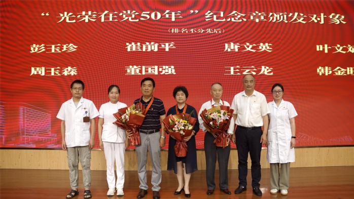在欢快喜庆的旋律中,医院党委书记陈晓宏向“光荣在党50年”老党员代表颁发纪念章,青年党员代表向老党员敬献鲜花,院领导依次为受到表彰的集体和个人颁发证书。