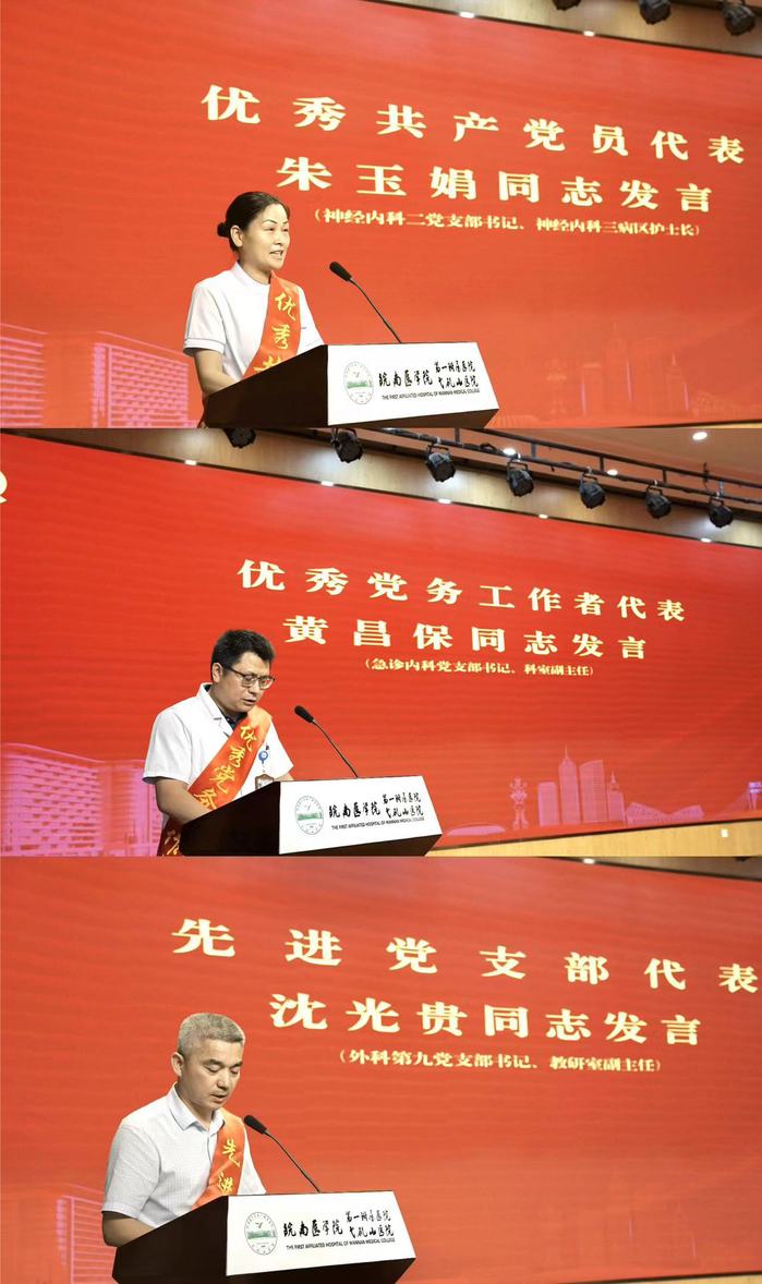 优秀共产党员代表朱玉娟、优秀党务工作者代表黄昌保、先进党支部代表沈光贵分别作交流发言,表示将珍惜荣誉,再接再厉,弘扬伟大建党精神,立足本职,开拓进取,勇毅前行,以实际行动为推动医院高质量发展作出新的更大贡献。