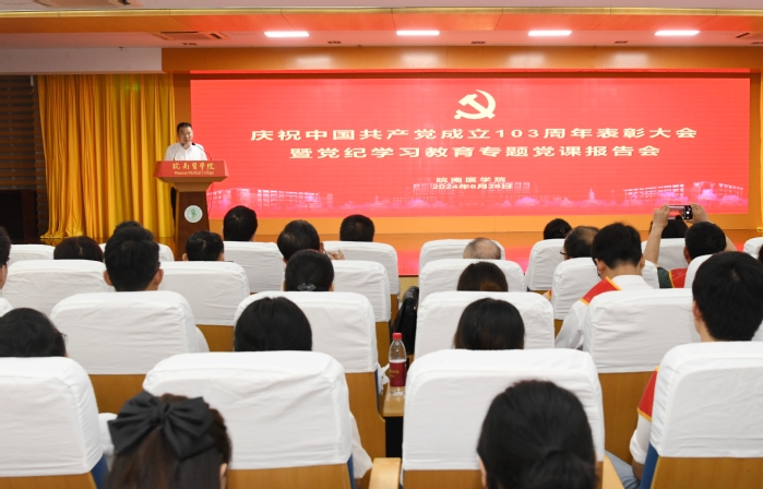栉风沐雨秉初心,砥砺奋进谱新篇。在中国共产党成立103周年到来之际,6月28日下午,我校在图书信息楼三楼学术报告厅举办庆祝中国共产党成立103周年表彰大会暨党纪学习教育专题党课报告会。校领导夏劲松、姚应水、贾贤燕、文育锋、王保中、韩永升出席会议,“光荣在党50年”老同志代表,受表彰的优秀共产党员、优秀党务工作者和先进基层党组织代表,处级干部,校本部党支部书记,附院党总支书记和新党员代表参加大会。大会由党委副书记、院长姚应水主持。