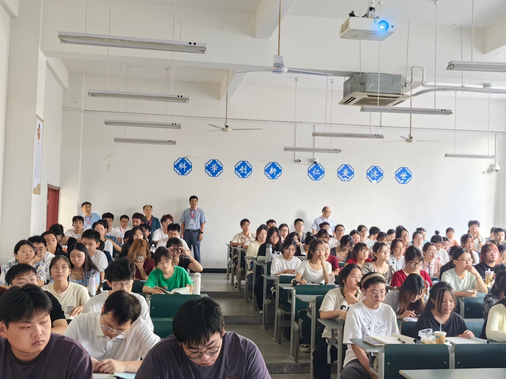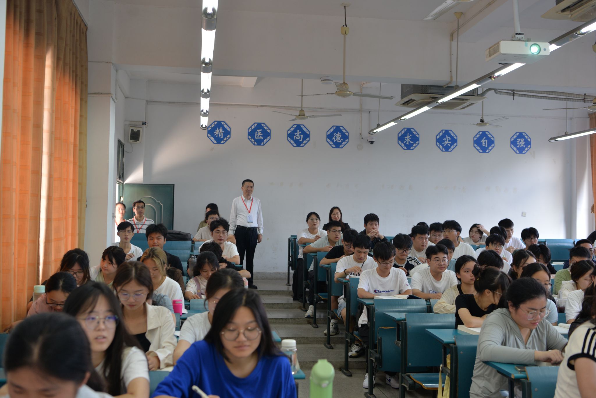 开学首日,全校共开设课程124门,授课教师达225人次,上课学生达2.7万余人次。校领导分别深入滨江校区的南区和北区、附属医院及在芜教学医院,详细检查教师教学、学生学习及教学设施运行情况。新学期教师备课充分,学生认真听课,师生精神饱满,教学效果良好,展现了我校新学期教风、学风建设的新气象、新面貌。