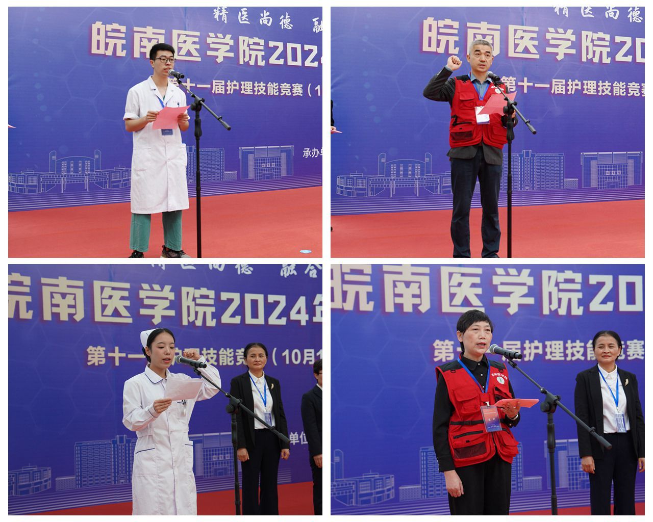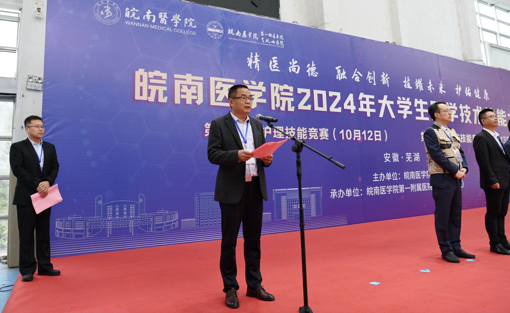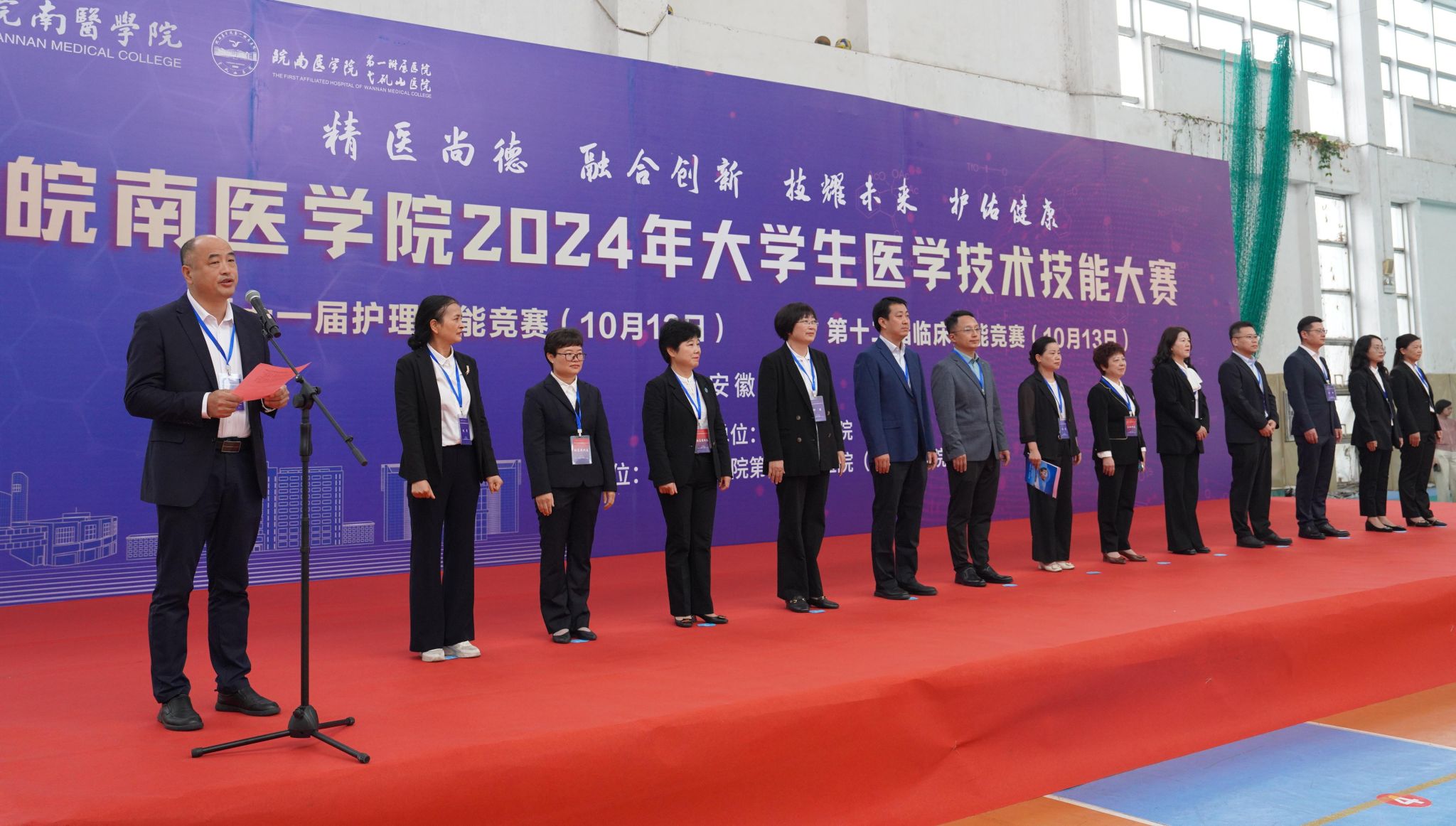 文育锋为大赛致开幕词。他首先代表学校向所有参赛队的领导和老师表示最热烈的欢迎和衷心的感谢,向积极备战、勇于挑战的全体参赛选手致以最诚挚的问候和美好的祝愿,向为本次竞赛付出辛勤劳动的工作人员和志愿者们表示崇高的敬意。文育锋指出,大学生医学技术技能大赛是推动临床教学模式和人才培养模式改革的重要抓手,是强化临床教育教学,建立科学化、规范化、标准化临床技能训练体系的示范工程。希望全体参赛选手要珍惜这次难得的机会,以饱满的热情、昂扬的斗志投入到比赛中,展现出扎实的基本功、敏锐的临床思维和良好的职业素养。希望各参赛单位以大赛为平台,加强交流与合作;以大赛为契机,加深医教协同;以大赛为引领,提升人才培养质量,推动我校医学教育向更高水平、更深层次发展。