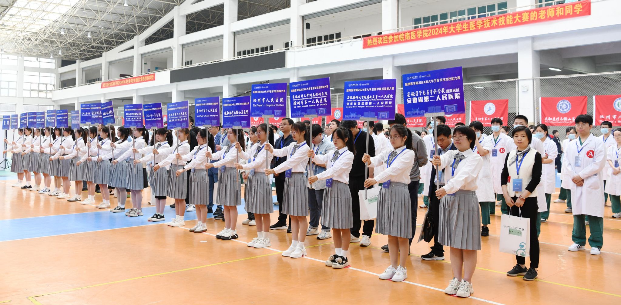本次临床技能竞赛有来自省内外的19支代表队共76名选手参赛,护理技能竞赛有22支代表队共88名选手参赛,大赛特邀南京医科大学周蕾教授担任临床技能竞赛总裁判长、南通大学徐旭娟教授担任护理技能竞赛总裁判长。教务处、学生处、临床医学院、护理学院、第一附属医院负责人参加开幕式。