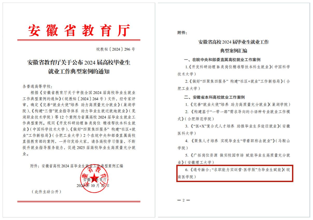 10月17日,安徽省教育厅发布通知公布2024届高校毕业生就业工作典型案例,我校申报的就业工作案例《通专融合:“求职能力实训营·医学版”为毕业生赋能》入选“安徽省高校2024届毕业生就业工作典型案例”。