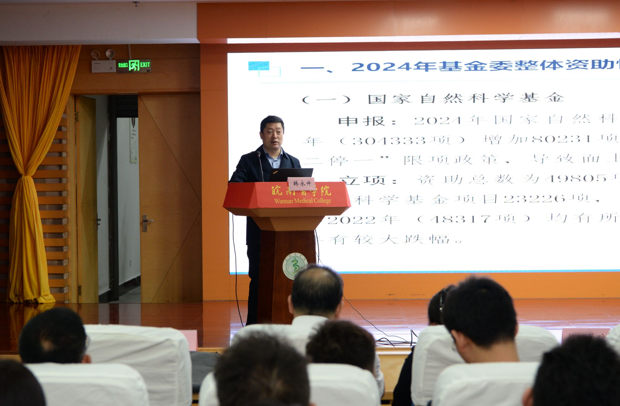 韩永升立足全国国家级项目申报和资助总体情况,对我校近五年国家级科研项目申报获批情况进行回顾,详细分析了我校近五年国家级科研项目获批人员结构、学科分布和发展趋势,重点介绍了我校2024年度国家级科研项目申报工作组织情况及工作成效,深入分析了我校国家级科研项目工作面临的形势、机遇和挑战,指出存在的问题和不足,并提出相应改进方向与对策。最后,根据年度科技工作目标责任制和国家级科研项目申报“三三三”工作实施方案要求,对我校2025年度国家级科研项目申报目标任务、工作举措以及时间安排进行了部署。