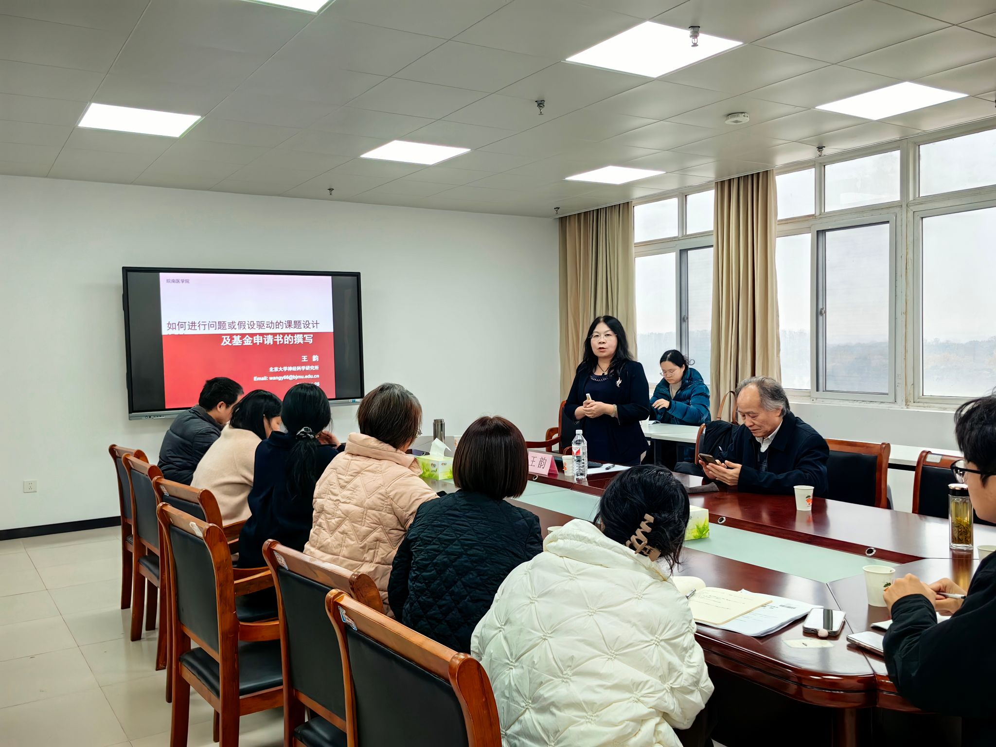随后,王韵教授来到滨江校区南区,以工作坊的形式作了题为《如何进行问题或假设驱动的课题设计及基金申请书的撰写》的报告,阐述了什么是好的科研设计,讲解了科研设计的原则及路线图,并结合具体案例,介绍了国家基金申报书中各个模块的撰写方法及注意事项,列举了往年基金申请出现的问题。与会老师围绕高质量标书撰写的细节问题与王韵教授进行了深入交流。