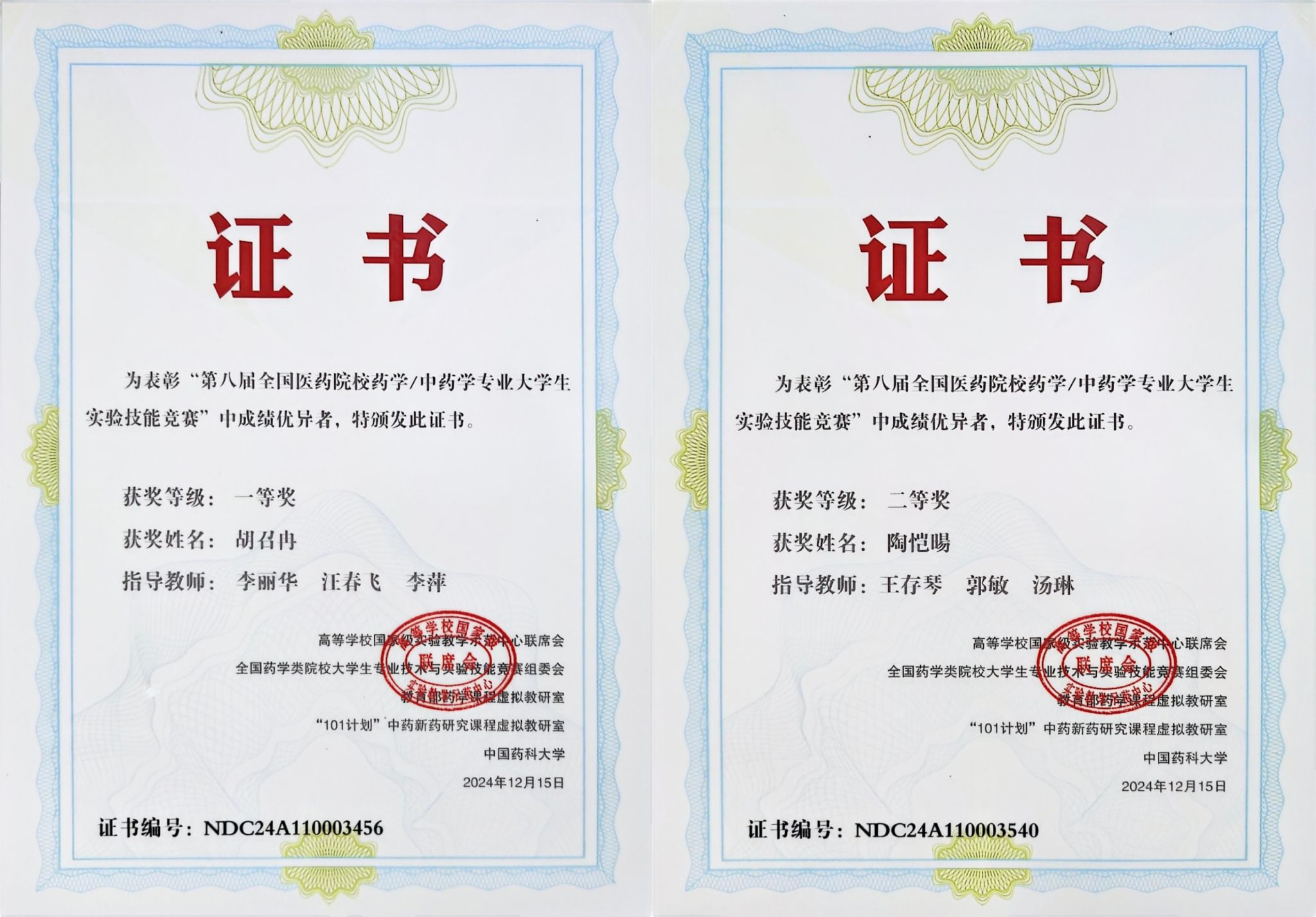 12月13日-16日,第八届全国医药院校药学/中药学专业大学生实验技能展示活动在成都圆满落幕。此次比赛由教育部高等学校国家级实验教学示范中心联席会、全国药学类院校大学生专业技术与实验技能竞赛组委会及中国药科大学等单位联合主办,成都中医药大学承办,来自全国148所高校的288名选手参加竞技。我校参赛队凭借扎实的专业知识和出色的实验操作技能,在众多参赛队伍中脱颖而出,获得一等奖、二等奖各1项。