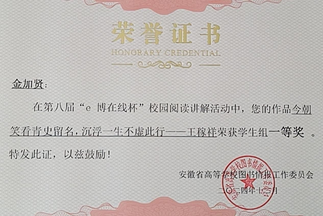 近日,由安徽省高等学校图书情报工作委员会主办、e博在线承办的第八届“e博在线杯” 经典共读·青春领航校园阅读讲解活动圆满落幕,我校师生获一等奖1项、二等奖1项、三等奖3项,1个学生社团获“优秀社团奖”,图书馆获“最佳组织单位奖。