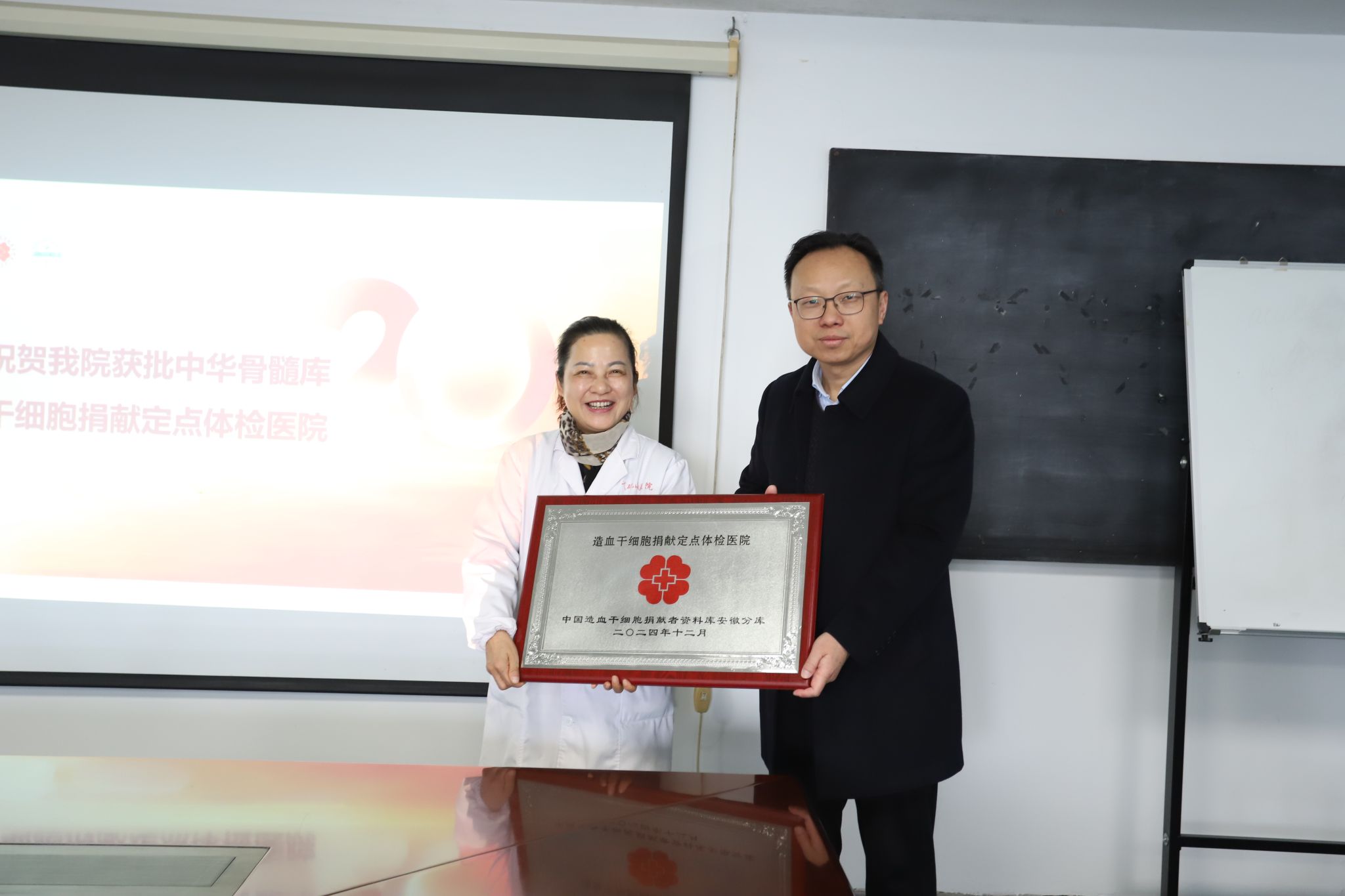 现场,曹芦松为第一附属医院“中国造血干细胞捐献者资料库安徽分库定点体检医院”授牌,第一附属医院由此成为全省首家获此资质的医院。