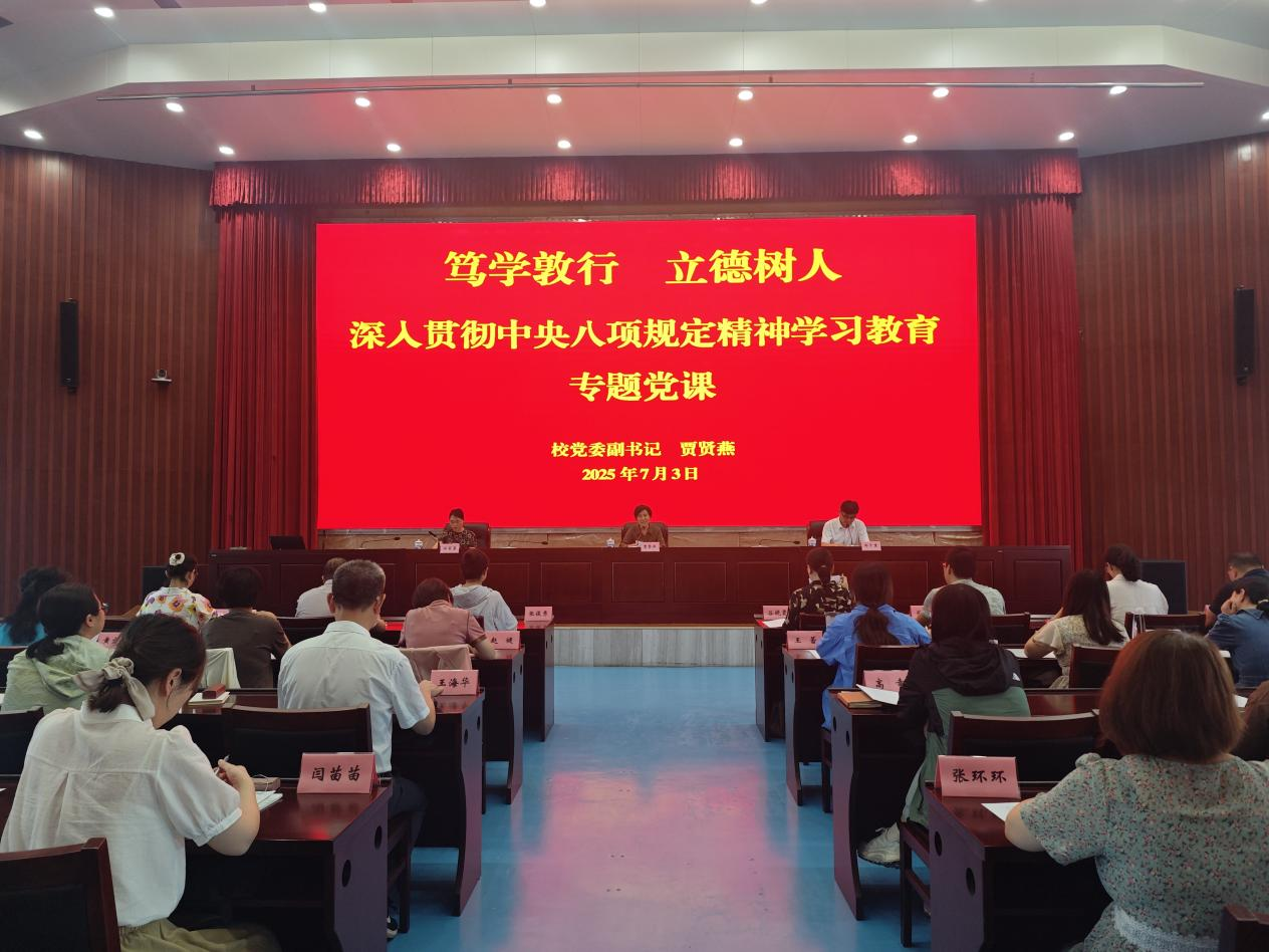 贾贤燕为全体学员上深入贯彻中央八项规定精神学习教育专题党课。她围绕学习贯彻习近平总书记关于加强党的作风建设的重要论述、贯彻落实中央八项规定精神的成效经验、违反中央八项规定精神的危害、锲而不舍贯彻落实中央八项规定精神等四个方面,结合学校实际,对进一步深化“学查改”,切实发挥党支部战斗堡垒和党员先锋模范作用提出要求。希望学员们珍惜本次培训机会,积极参与交流研讨,把学习成效体现在实实在在推进深入贯彻中央八项规定精神学习教育上,体现在以高质量党建引领学校各项工作实现新突破上。