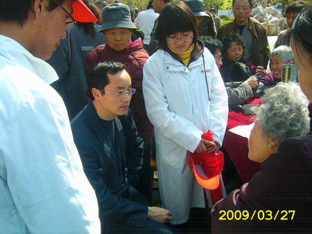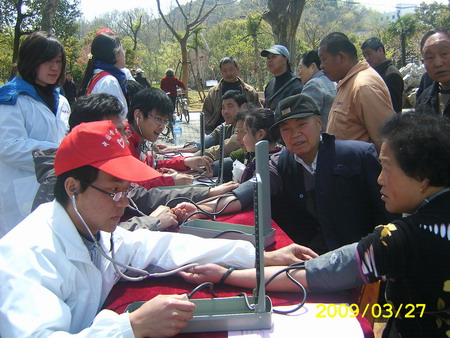 弋矶山医院心内科医生邢文解答老人们的咨询 清晨八点左右,细雨��,同学们热情高涨地来到了赭山公园,开展为期一天的实践活动。活动中每一位同学都尽心尽力,利用自己所掌握的医学知识,对老人们提出的问题耐心细致地解释。测量血压时,在邢文老师的指导下,每位同学都规范地操作着每一个步骤。大家一直工作到下午四点半,共接待咨询人员约1000余人次,尽管同学们都很疲惫,但是大家纷纷表示,这样的活动很有意义,能将所学的知识服务于社会,并能向社会展现皖医学子的良好精神风貌,还可在实践中增加阅历,以后要多参加此类活动。同学们的热情也赢得了老人们的连声称赞。
