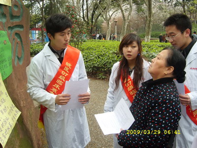 为关注老人身体健康,有效预防老年疾病,3月29日,医学一系2007级(14)全体班同学在赭山公园开展了一场主题为“关爱老人,预防疾病”的公益性活动。