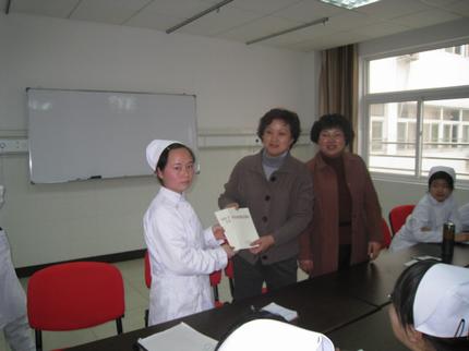 座谈会现场 检查组检查了该院护理部的实习计划落实及实习带教情况,当天下午,又召开了实习生座谈会。同学们首先肯定了医院护理部的认真带教及对学生的关爱,并对实习带教提出了一些建议。座谈会上,朱丹同志还传达了学校关于深入开展学习实践科学发展观活动的部署和要求;并把《科学发展观重要论述摘编》、《毛泽东邓小平江泽民论科学发展》两本学习资料发给党员,要求党章学习小组认真组织学习并结合实践开展活动,务求取得实效。