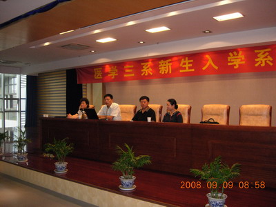 9月9日上午,医学三系在图书馆3楼学术报告厅举行新生入学教育大会,医学三系余海燕主任�陈阳副主任�唐传莉副主任�系秘书谢海烽老师�张越老师�团总支姚成元老师�张萍老师�08级辅导员杨丹老师�贾玲老师以及08级新生共330余人参加了会议,会议由唐传莉副主任主持。