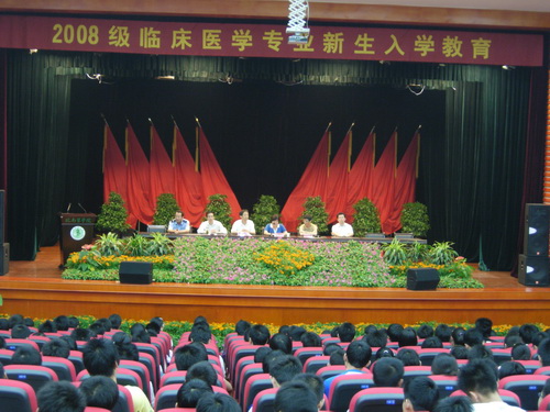 ![]() 系党总支书记杨新庆同志代表全系师生发表了热情洋溢的欢迎辞,真诚地欢迎2008级新生成为皖医的一员;系主任吴佩介绍了我系的悠久历史和优良传统,并结合医学生誓言,对新生未来的五年大学生活提出了殷切的期望。系秘书蒋韶明、韩军结合实际,就学校的校规校纪、大学生管理规定、大学生角色转换、学风建设等方面,给广大学生做了生动、细致、全面的讲解,为学生尽快融入新环境、新生活提供了帮助。校保卫处周黎明、校医院储召阳分别就大学生的安全、健康和医疗保险问题做了详细的报告,希望广大学生重视自身安全健康,圆满顺利地完成大学学业。最后,方国庆副主任结合新生常见问题,指出大学生要增强自理能力,全面提高自身素质,争做一名优秀的当代大学生。