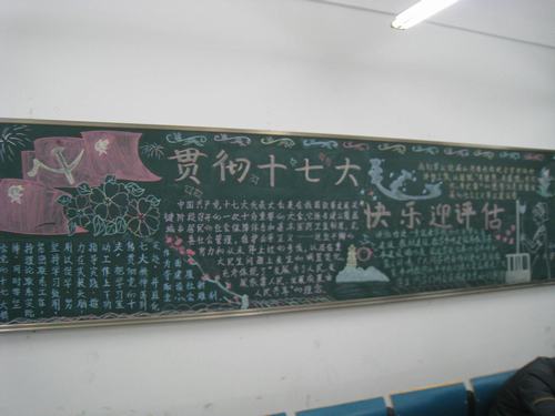 板报以“迎评估,庆奥运,学习和弘扬十七大精神”为主题。 “迎评估,创辉煌”、“奥运畅想”、“学习十七大为祖国喝彩,为青春增色”、 “生活小贴示”、“英语之家”、“水果乐园”等板块,丰富的内容,隽秀的字体,激扬的文字,生动的画面,无不淋漓地展现了天使们的才华,也进一步营造了良好的学习氛围。