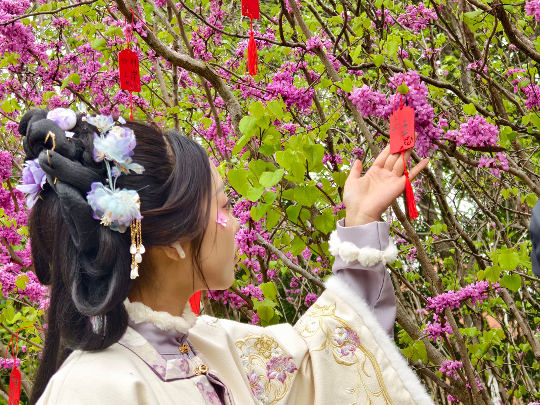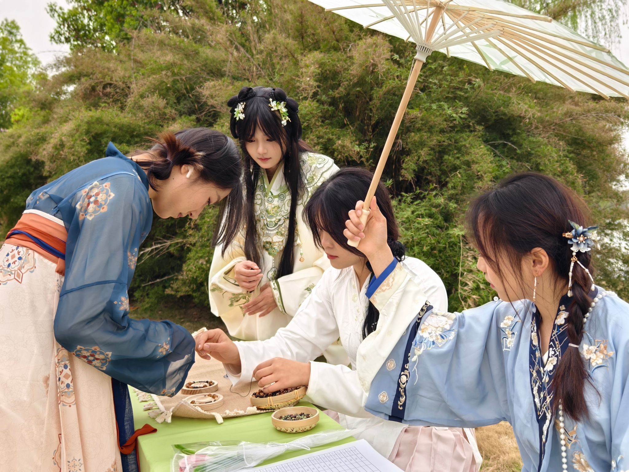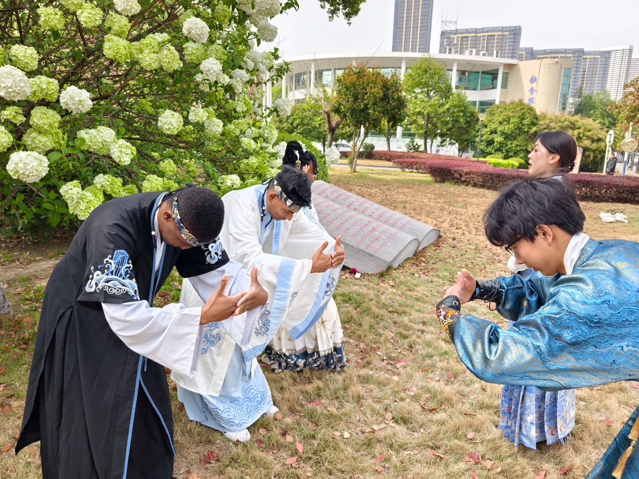 3月30日,在“中国华服日”(农历三月初三)来临之日,校大学生礼仪团举办的“云起霓裳,锦绣同袍”主题华服游园会吸引了众多中外学子的热情参与。同学们身着华服,相聚小西湖畔,体验投壶游戏中“贯耳入壶”的精准一击,挑战灯谜长廊“射虎夺魁”的脑力激荡,感受箭在弦上“百步穿杨”的飒爽英姿,修习礼仪课堂中“揖让周旋”的君子之风……在这场穿越千年的国风市集中,同学们不仅亲身体验了传统文化的魅力,更在衣袂翩跹间感受到中华文明的生生不息。