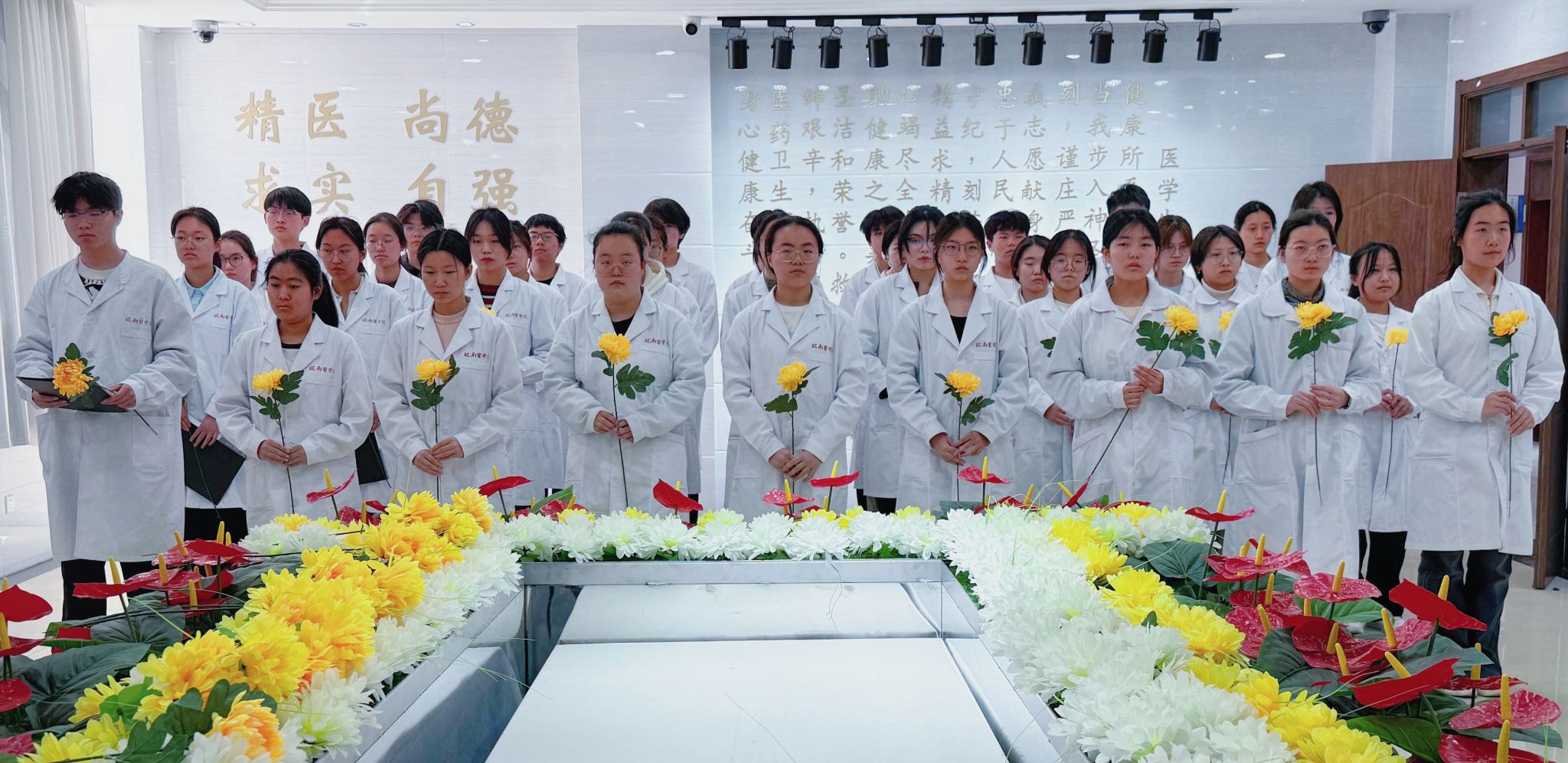 4月3日,校学生会团支部36名同学身着白衣,共聚学校遗体缅怀室,追思缅怀为医学教育和科研事业献身的“大体老师”们。同学们手持素菊敬花默哀、集体朗诵《致敬大体老师》、分享心得感悟、重温医学生誓言。4月4日上午,校团委师生代表前往芜湖市烈士陵园开展“缅怀先烈志,奋进新征程”主题活动。师生们整齐列队,敬献花篮并集体默哀。随后,校第十六期青马工程学员代表、校国旗护卫队队员现场演讲,全体人员合唱歌曲《我和我的祖国》,激昂的歌声在烈士陵园上空回响,彰显着传承先辈精神、矢志报效祖国的青春担当。