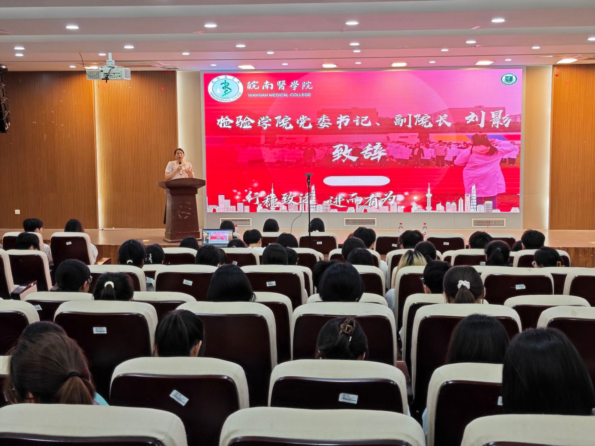 刘影在致辞中代表学院全体教师表达了对同学们的深切关怀。她以详实的数据深入剖析了学院今年考研情况以及未来考研发展趋势,着重强调了考研初试、调剂、机遇把握及就业抉择等关键事宜,为2022级即将实习的同学们勾勒出考研征程的整体轮廓和未来前景,字里行间满是对学子们的殷切期盼。