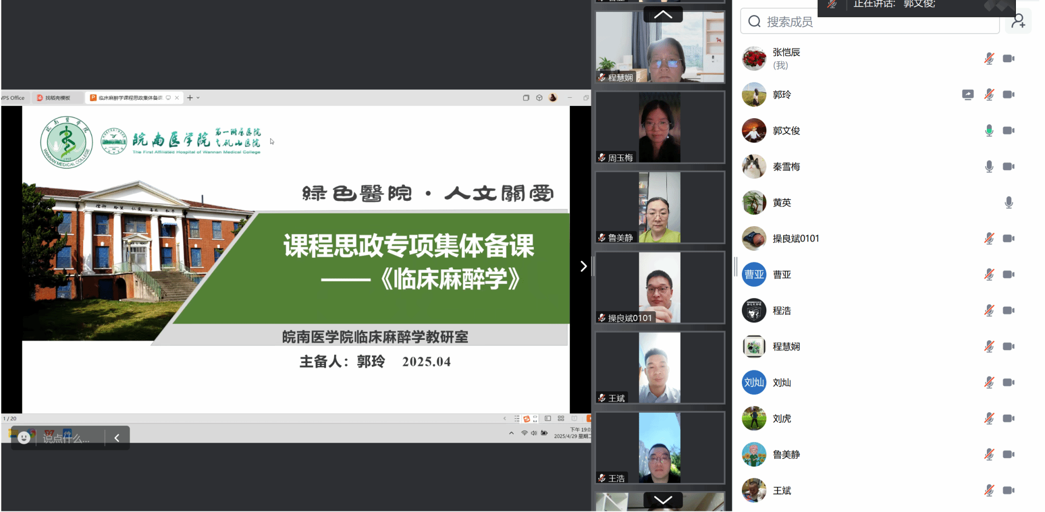 为深入贯彻落实立德树人根本任务,全面推进课程思政建设,深化专业课程与思政教育有机融合,4月29日晚,麻醉学院组织临床麻醉学教研室、重症医学教研室联合举办课程思政专项集体备课。本次活动邀请马克思主义学院黄英教授全程参与指导,学院院长郭文俊主持集体备课。
