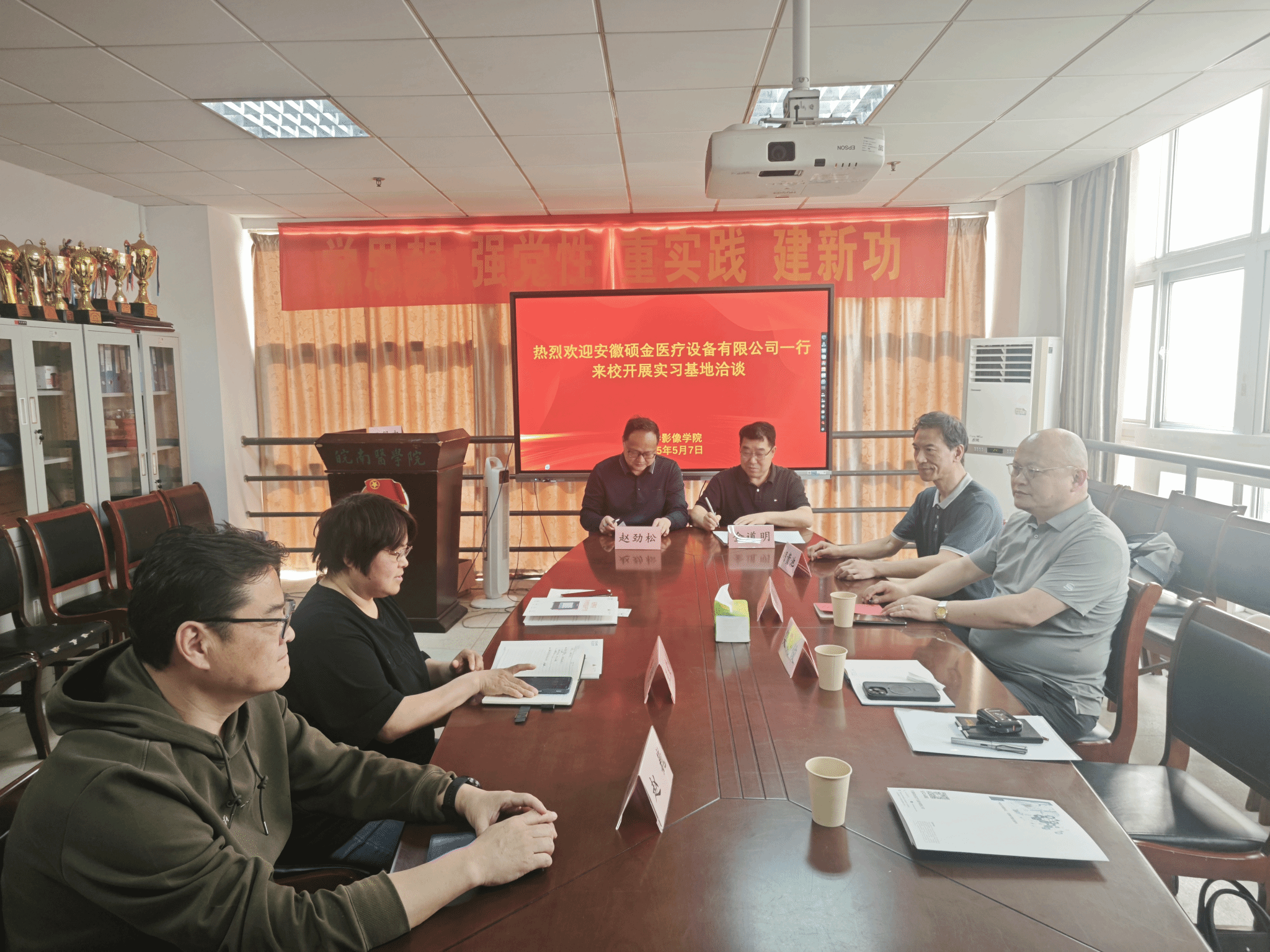 为提高生物医学工程专业人才培养质量,开拓学生实习基地和就业渠道,5月7日下午,安徽硕金医疗设备有限公司董事长金道明一行来访医学影像学院,就共建实习就业基地开展洽谈交流,受到学院党委书记王爱侠、院长赵劲松热情接待。