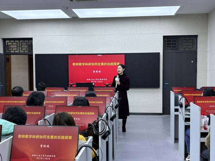 为进一步提高外语教学科研水平,12月6日中午,公共基础学院邀请安徽工业大学外国语学院院长曹瑞斓教授来校作教学科研讲座。讲座由外语教研室章洪流主持,教研室全体教师参加。