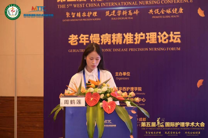 本次会议以“聚智精准护理  筑建学科高峰  共促全球健康”为主题。来自全国各地和英国、澳大利亚等国家的护理专家教授,围绕全生命周期健康与疾病精准护理学建设、交叉医学融合、护理管理体制、数字卫生保健等议题开展学术交流。在交流论坛上,我校护理学院研究生周鹤莲作题为《The association between illness perception and health-related quality of life among middle-aged and elderly Chinese with Coronary Heart Disease: The mediating role of coping style》的发言交流,着重介绍老年慢病精准护理重点领域冠心病患者健康相关生活质量管理和心理行为路径介导的研究进展。