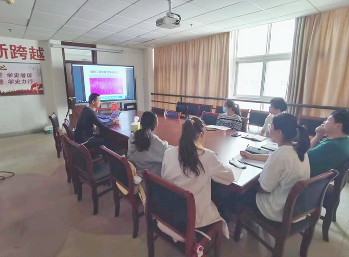 在交流会中,苑志国博士就软骨局限性缺损的组织工程修复进行了介绍。他结合解放军301医院郭全义教授课题组的相关资料,分享了通过人源脱细胞材料对于局限性软骨缺损修复的临床案例,并就相关工作引申至口腔颞下颌软骨相关疾病的组织工程治疗方法的可能进行了系统性阐述。现场师生就颞下颌关节软骨修复的相关问题与苑志国博士进行了深入交流,并就安徽省口腔材料与应用转化工程研究中心的发展、研究方法、建设方向等进行了热烈探讨。
