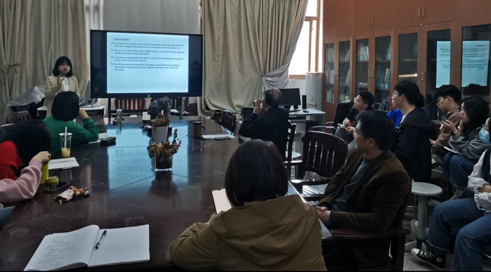 査盈盈副教授以“浅谈纳米材料在生物医学中的应用”为标题,从“纳米材料的概念和应用前景”开题,再具体到“纳米材料在生物医学领域的应用”,并通过课题设计路径以文章“Long-term maintenance of synaptic plasticity by fullerenol ameliorates lead-induced-impaired learning and memory in vivo”为主线,详细介绍近期研究成果。她既富有创新性又有明显实用价值的研究成果,引起参会师生的热烈讨论,尤其是清晰的课题设计思路,给在场的“启明星”小组成员和研究生进行科研创新以新的启发与感触。