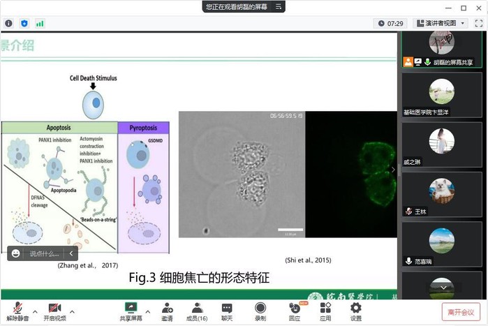 胡磊结合在博士学习阶段开展的细胞焦亡相关活化信号通路研究展开讲座。他表示细胞焦亡是一种Gasdermin蛋白家族介导的促炎性程序性细胞死亡方式,与GSDME的表达水平密切有关,即高表达诱导细胞发生焦亡,反之诱导凋亡。研究表明,化疗药物引起的细胞焦亡是BAK/BAX-caspase-3-GSDME信号通路依赖的,且以GSDME的棕榈酰化修饰来促进活化而引发。该研究结果为干预肿瘤发生发展提供了新策略。整个讲座内容丰富,构思精妙,汇报精彩,给与会者提供诸多科研思路与方法借鉴。