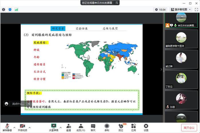 范喜瑞博士着重汇报了茶叶中的非蛋白质氨基酸L-茶氨酸对前列腺癌作用及相关机制研究。她指出,研究发现,L-茶氨酸可以通过调节ERK/NF-КB信号通路来影响p65分子与肿瘤转移关键因子MMP9和Snail启动子区域的结合,导致MMP9和Snail分子的表达抑制,进而发挥了抗前列腺癌转移的作用。该研究结果为临床精准治疗前列腺癌提供了新的靶向策略。整场报告思路清晰,内容丰富,给与会人员留下深刻印象。