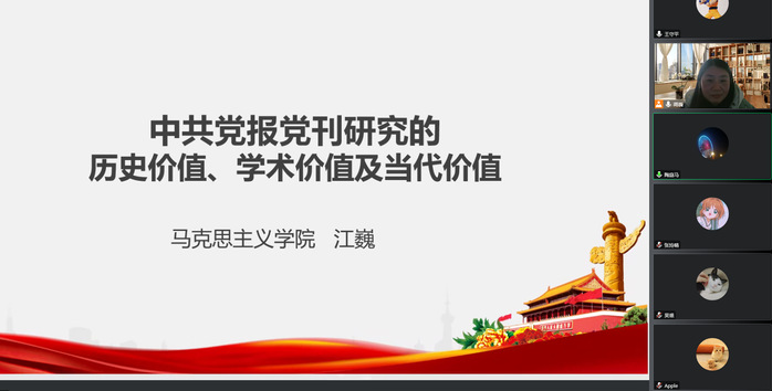 马克思主义学院江巍博士以“中共党报党刊研究的历史价值、学术价值及当代价值”为题,通过线上方式作学术讲座以中共党报党刊发展的百年历程为切入点,系统梳理了建党至土地革命时期、抗日战争至解放战争时期、新中国成立至新时代党报党刊的发展演进情况,总结了当前党报党刊的研究现状及存在问题。江巍博士表示,党报党刊是党的喉舌,与党的成长壮大关系密切,一方面有其历史价值,是一笔宝贵的历史财富,是我们了解和学习中共党史的生动素材;另一方面有其学术价值,有利于充实中国近代报刊史、新闻史和文化史的研究,深化中共党史、新中国史、改革开放史和社会主义发展史的研究并提供丰富材料,进一步丰富马克思主义理论、中共党史党建等一级学科研究的视角和领域。整场讲座思路清晰、内容丰富、深入浅出,与会教师一致表示受益匪浅。