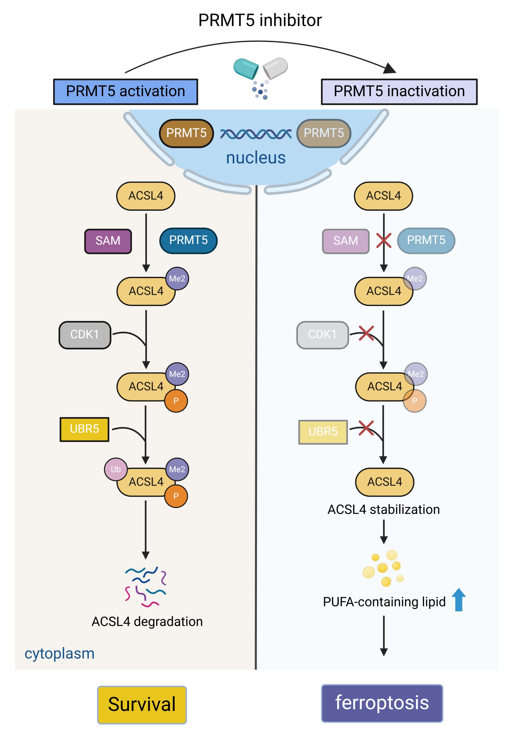 本次研究中,团队成员通过在包含765种表观遗传的化合物文库中使用RSL3诱导的肾癌细胞铁死亡模型进行筛选,发现多种PRMT5抑制剂可显著促进RSL-3诱导的肾癌细胞铁死亡。利用细胞实验进一步验证了PRMT5能够抑制RSL-3诱导的肾癌细胞脂质过氧化水平并提高细胞活力。随后通过分子细胞实验揭示,PRMT5通过甲基化修饰铁死亡关键调节因子ACSL4来促进其泛素化降解,进而抑制铁死亡,最终促进肾癌发生发展。