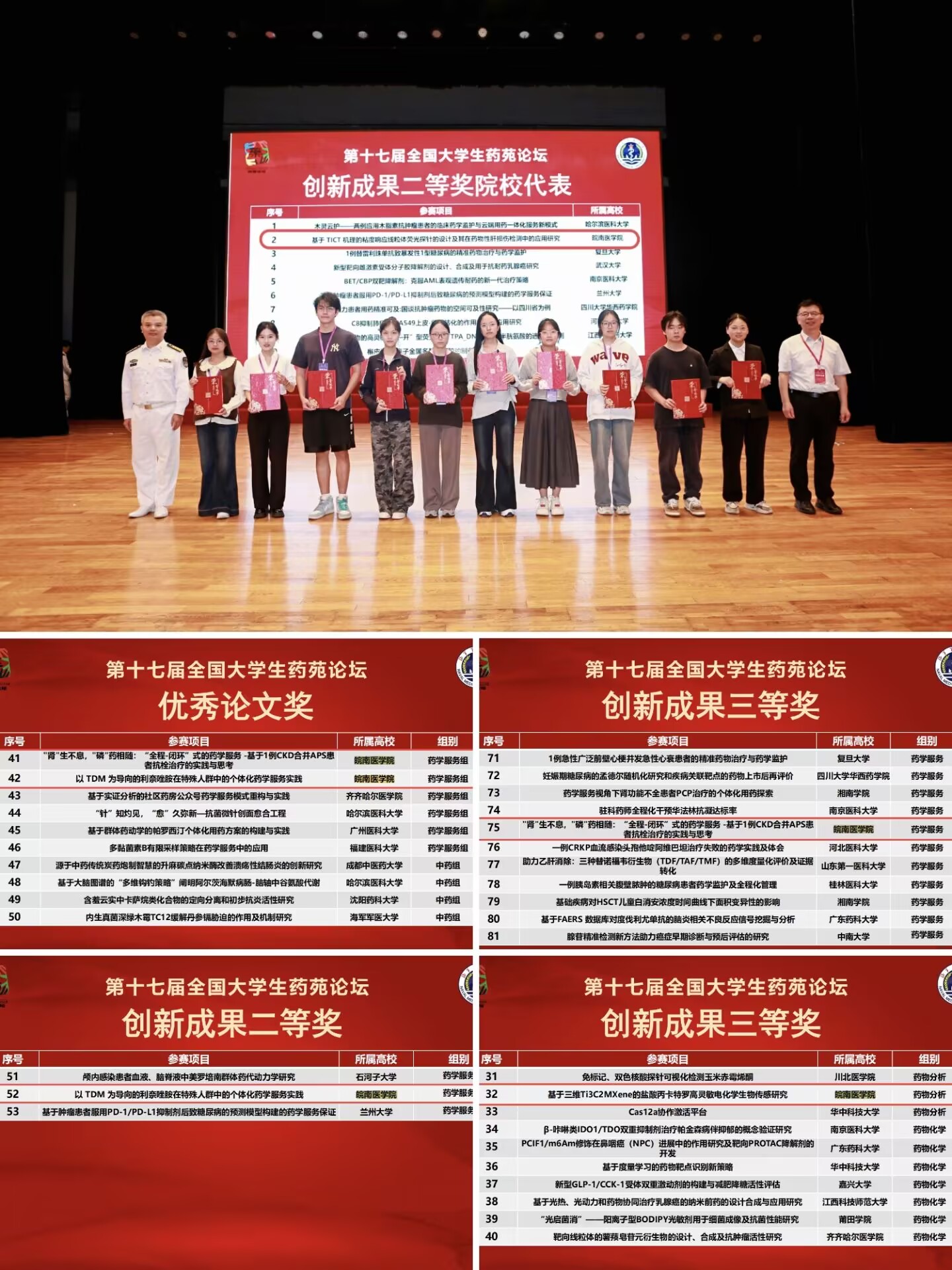 作为全国药学领域极具影响力的大学生学术交流与创新竞赛平台,全国大学生药苑论坛旨在搭建高校药学专业学生交流学习的桥梁,激发学子创新潜力,推动药学领域产学研用深度融合。本次论坛汇聚了全国百余所高校的优秀药学学子,分为药学服务、药学科学两大核心赛道,覆盖从基础研究到临床应用的全链条药学领域,围绕“论文、壁报展示、创新成果汇报”三大核心环节进行展示。经过激烈竞赛,药学院遴选的四个项目全部获奖,学生分获药学科学赛道二等奖、三等奖各1项,药学服务赛道二等奖、三等奖各1项,优秀论文奖2项,其中药学服务赛道首获二等奖,实现了新突破。